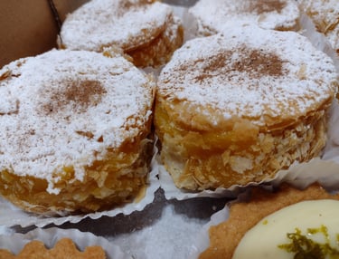 Folhado redondo com creme português, polvilhado com açúcar de confeiteiro e canela. Aroma e sabor inconfundíveis.