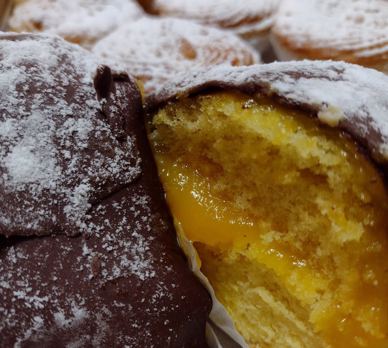 Folhado crocante com recheio de creme português ou chocolate, perfeito para quem ama texturas e sabores contrastantes.